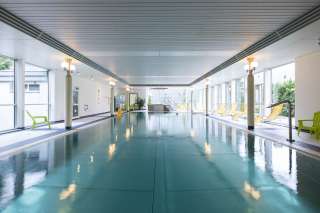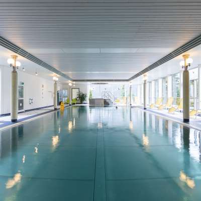 Ein grosses Hallenbad, Whirlpool, eine finnische Sauna (90°C und trockene Luft) und ein Sanarium (60°C und tropisches Klima) laden zum Entspannen ein.