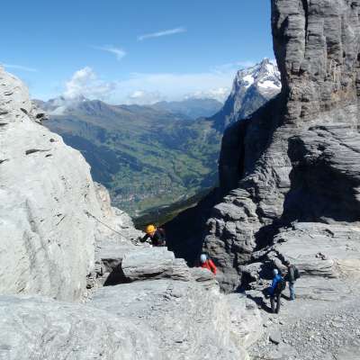 Ausgestattet mit Klettergurt und Helm und unter Anleitung Ihres UIAGM-Bergführers starten Sie Ihr Abenteuer in der berühmten Eiger-Nordwand. Nach einer kurzen Wanderung zum Einstieg führt der Aufstieg über Felswände und Leitern zum Westgrat des Eigers. Am Ende folgt ein kurzer Aufstieg und wir stehen auf dem Rotstock, einem eigenständigen Gipfel inmitten der mächtigen Eiger-Nordwand.