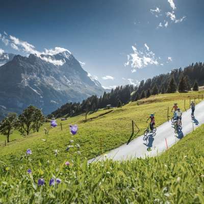 Die Firstbahn bringt dich bequem zum Startpunkt bei der Mittelstation Bort. Mit einem Helm geschützt fährst du dann über wenig befahrene, asphaltierte Strassen nach Grindelwald hinunter. Für Kinder stehen Mini-Trottibikes zur Verfügung.